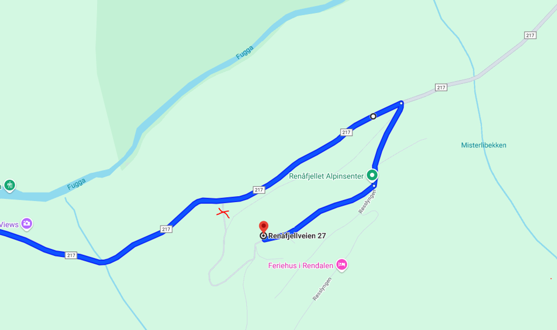 - the other option is to continue straight in Rena (11.6 km extra) until you reach the junction with the Fv30 towards Koppang. Keep following the Fv30, at Åkrestrømmen you turn right onto the 217. In winter this route is better maintained/faster.